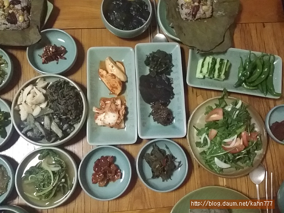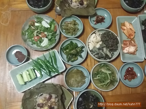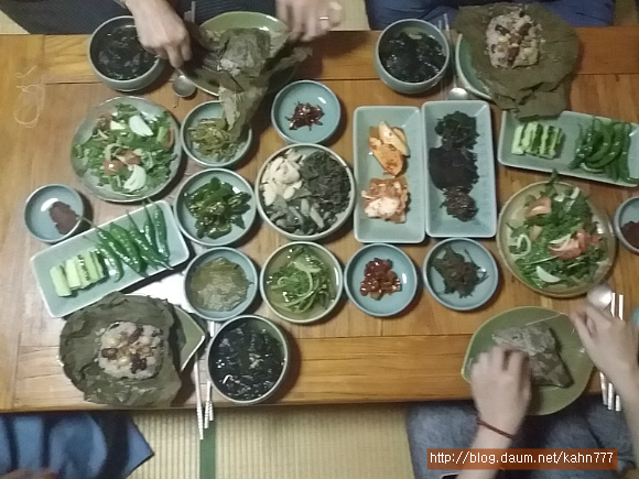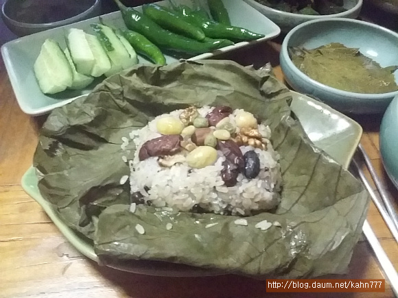 우리가 도착하면서 저녁상을 차리기 시작했는데 전식으로 연잎차를 마실 수 있었다. 이 집의 연밭에서 난 연잎으로 직접 만든 차라고 했는데 연향이 은은하게 다가왔다. 저녁상은 구이도 찌게도 없이 연잎밥과 홍합 미역국으로 차렸지만 감동 수준이었다.