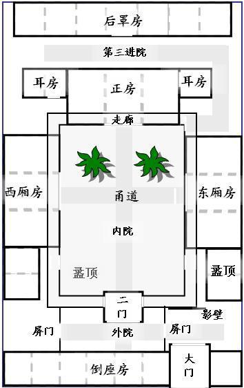 중국은 중정에서 각 실로 출입하지만 외부공간은 동선을 이어주는 역할을 주로 수행한다. 집의 규모에 따라 넓은 중정을 가지게 되면 통로 이외에 정원을 꾸미기도 한다. 대지의 가운데를 비우고 외곽으로 집을 채워서 짓게 되므로 외부공간은 집의 규모에 비해 한정적으로 만들어질 수밖에 없다.