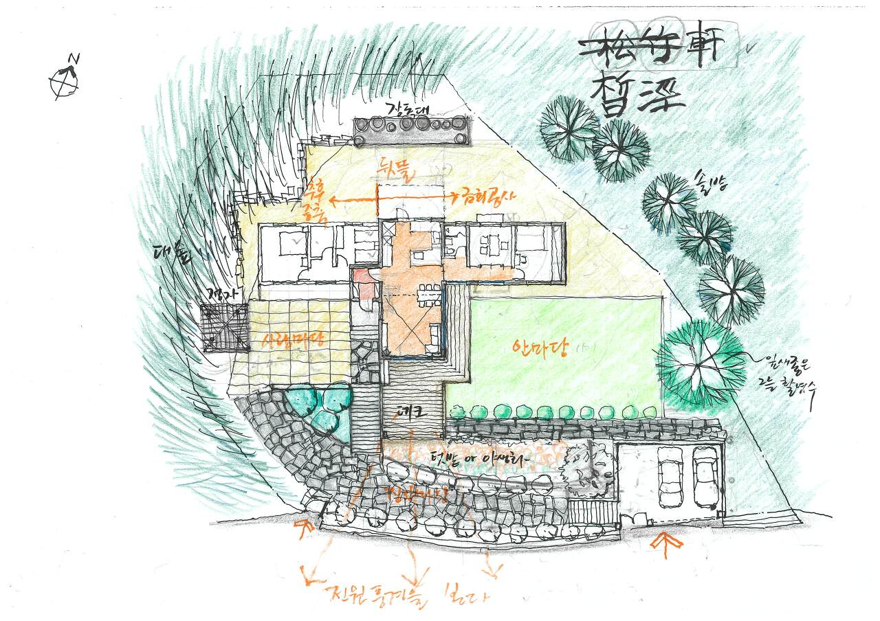 그 밖에 이런저런 이야기를 나누며 전원에 단독주택을 지어서 살아갈 건축주의 행복한 일상을 설계자가 제안해야겠다고 생각했다. 300 평이 넘는 작지 않은 터에 대숲과 풍채 좋은 송림에 둘러싸여 있는 데다 남향으로 전원을 내려다 보고 있으니 이만한 여건이 쉽지 않다.