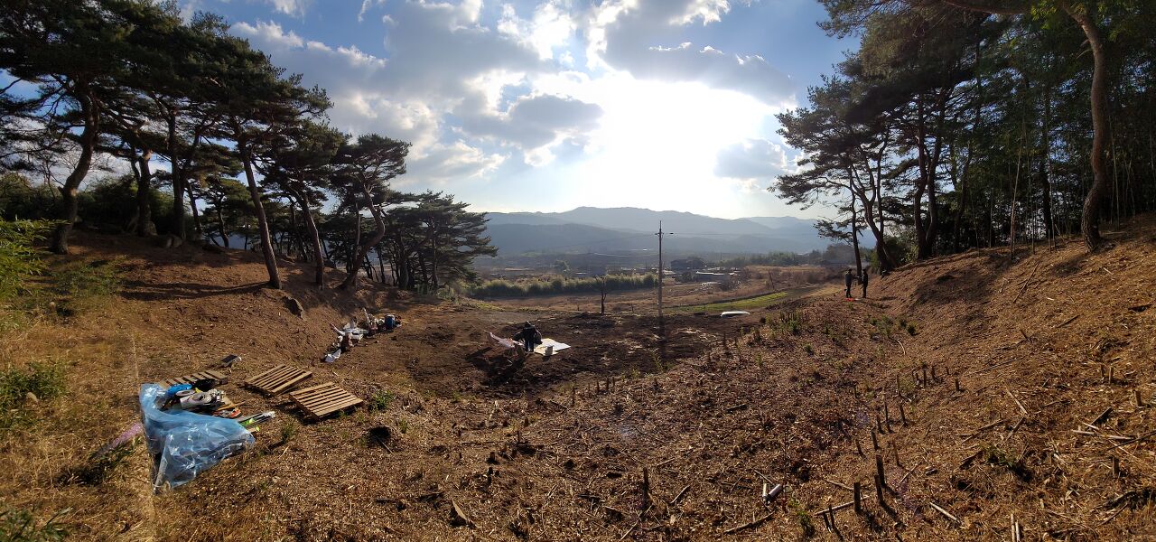 그림 같은 노송이 병풍처럼 둘러싸고 남향으로 열려 있는 집터이다. 300 평이 넘는 적지 않은 대지 면적이 부담스러운 작업이었다. 도로에서 4미터 정도 높이에 평지가 조성되어 있어 올라오는 경로를 결정하는데 난관을 거쳐야 했다.