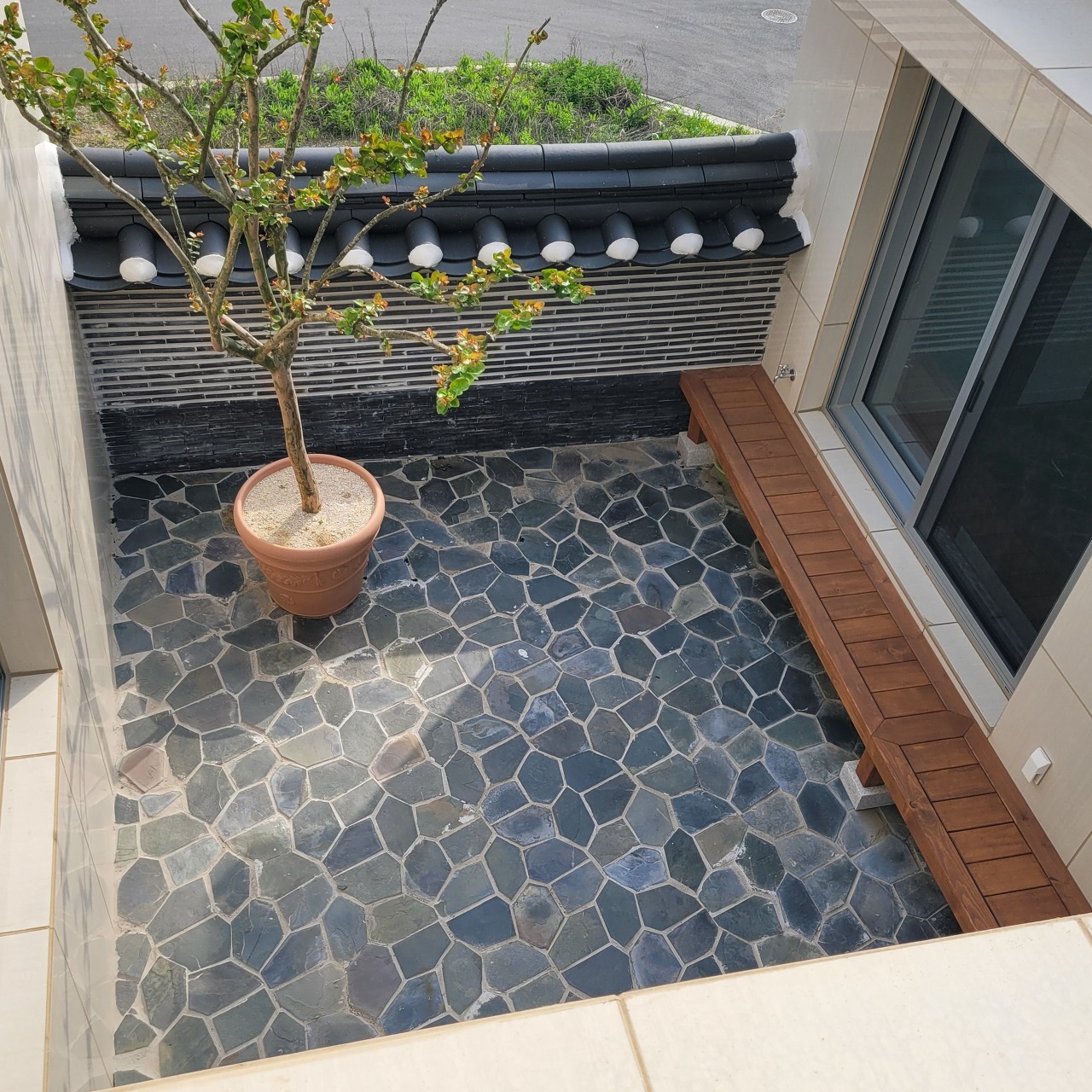 3층 단독주택은 설계자가 마음먹고 공간을 구성했기에 인테리어 팀이 작업에 참여할 수 있어서 완성도에 큰 기대를 걸 수 있었다. 마당과 거실은 다른 상가주택에서 구현할 수 없는 콘셉트로 시도되었다. 현관문을 열면 맞닥뜨리게 되는 마당은 3층에 있는 집이라는 느낌을 지우게 한다. 한옥 담장은 오브제로, 툇마루는 마당을 쓰는 특별한 감흥을 줄 수 있게 의도했다.