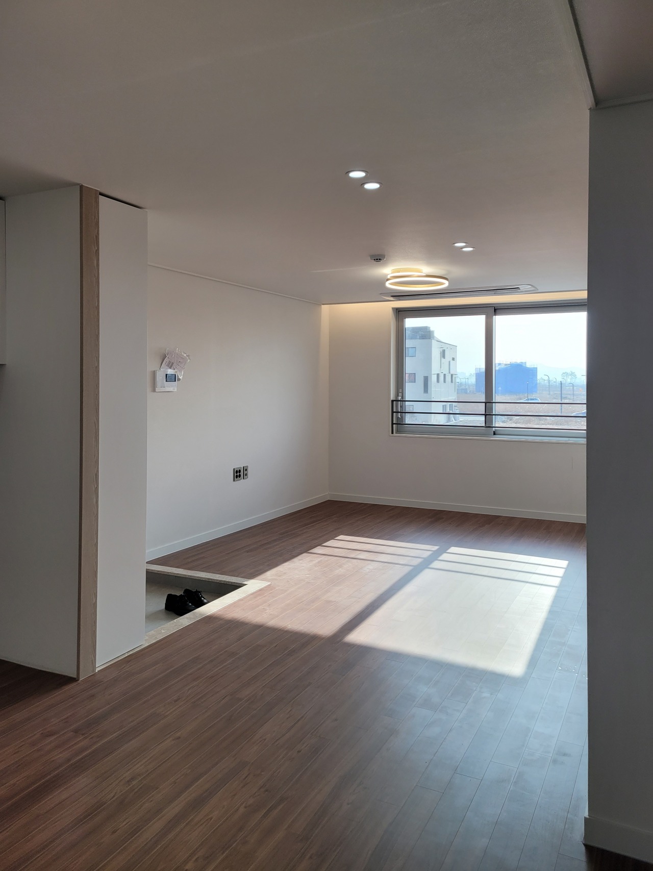 거실은 아파트와 어떻게 다를까? 내가 단독주택을 설계하면서 경사 지붕이 아닌 평지붕을 쓴 건 이안정이 처음이었다. 에코델타시티 주거단위계획에 경사지붕과 평지붕을 섞을 수 없게 되어 있기 때문이다. 그래서 평지붕으로 외관을 구성하면서 층고를 4.2미터로 해서 거실 공간의 깊이를 더했다. 인테리어 디자인이 특히 필요한 공간이다.