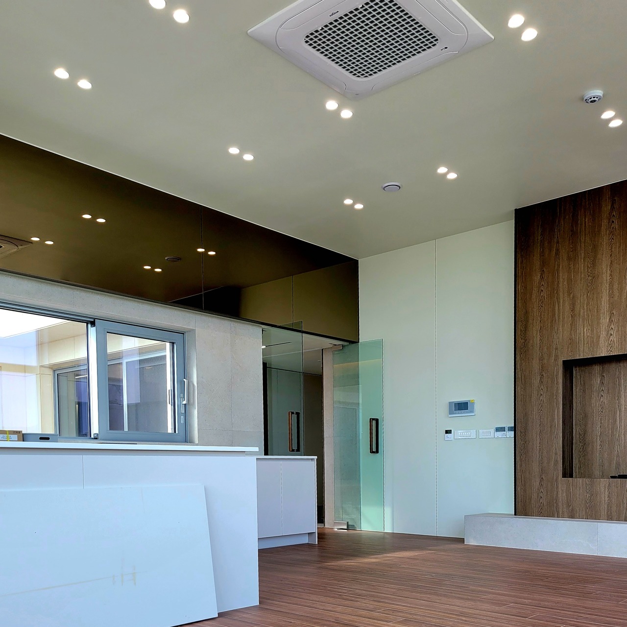 거실 벽은 큰 창문이 남과 서로 나 있어서 벽면까지 디자인이 들어가면 공간이 산만해진다. 또 가구를 아무리 잘 골라도 존재감이 없어지니 천장 디자인만 살리고 벽면은 그대로 두자는 의견을 냈다. 공사 비용도 생각해야 하는 건축주도 이에 동의를 해서 거실 인테리어 디자인을 확정할 수 있었다.