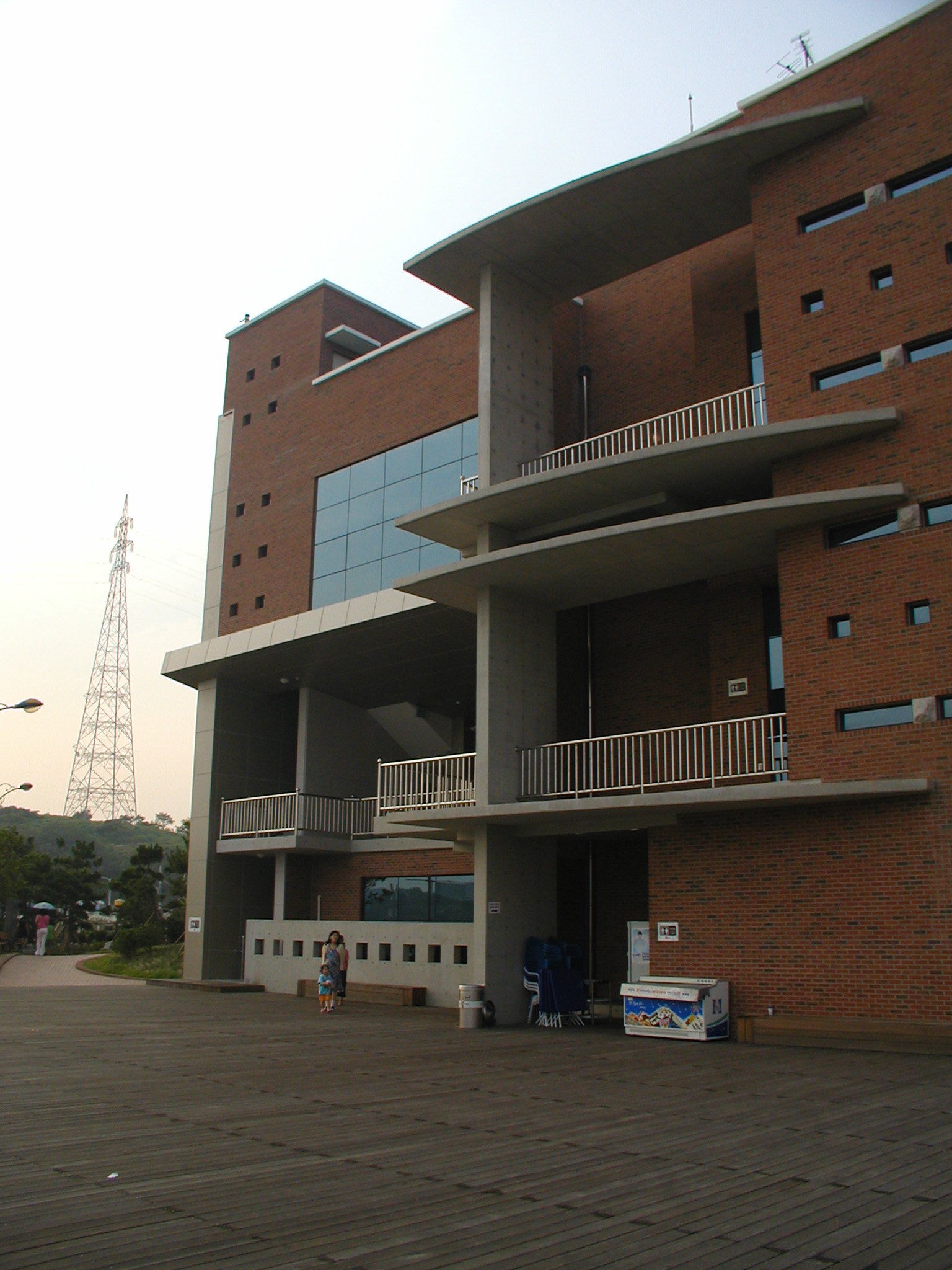 넓은 피로티 공간을 만들었지만 태풍 등의 염려로 일방적인 유리 벽이