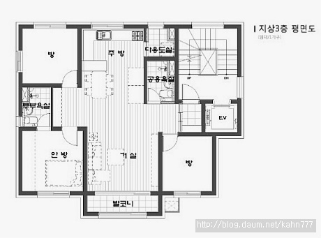 제가 작업한 삼층 평면은 그 세 가지가 다 충족이 되도록 작업이 되었습니다. 주방은 대형냉장고와 스탠드형 김치냉장고의 자리와 식탁도 정위치에 있습니다. 안방에 샤워부스가 설치된 욕실, 거실 앞의 발코니가 있어 확장형 아파트의 평면과는 사뭇 다른 주거환경이 보장되는 집이 되었습니다.
